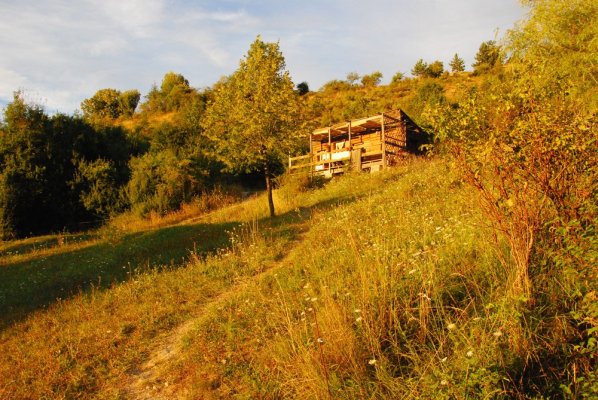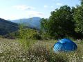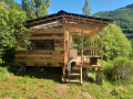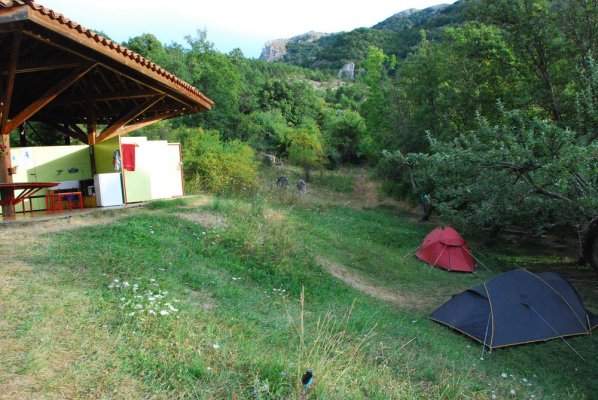 1 Bounga-yourte , entre yourte et cabanon, c'est une structure en bois de forme octogonale, couverte de toile et isolée de laine. Vous y trouverez tout le nécessaire pour la cuisine, un frigidaire, une table ronde et un coins bureau, un lit double et un clic-clac. Il n'y a pas l'eau courante à l'évier mais la source est tout près pour remplir la réserve. La Bunga-yourte peut accueillir jusqu'à 4 personnes. Elle est située tout contre un petit ruisseau sur la partie haute du camping (800m du village) dans une prairie arborée qui bénéficie d'une vue magnifique sur la vallée.